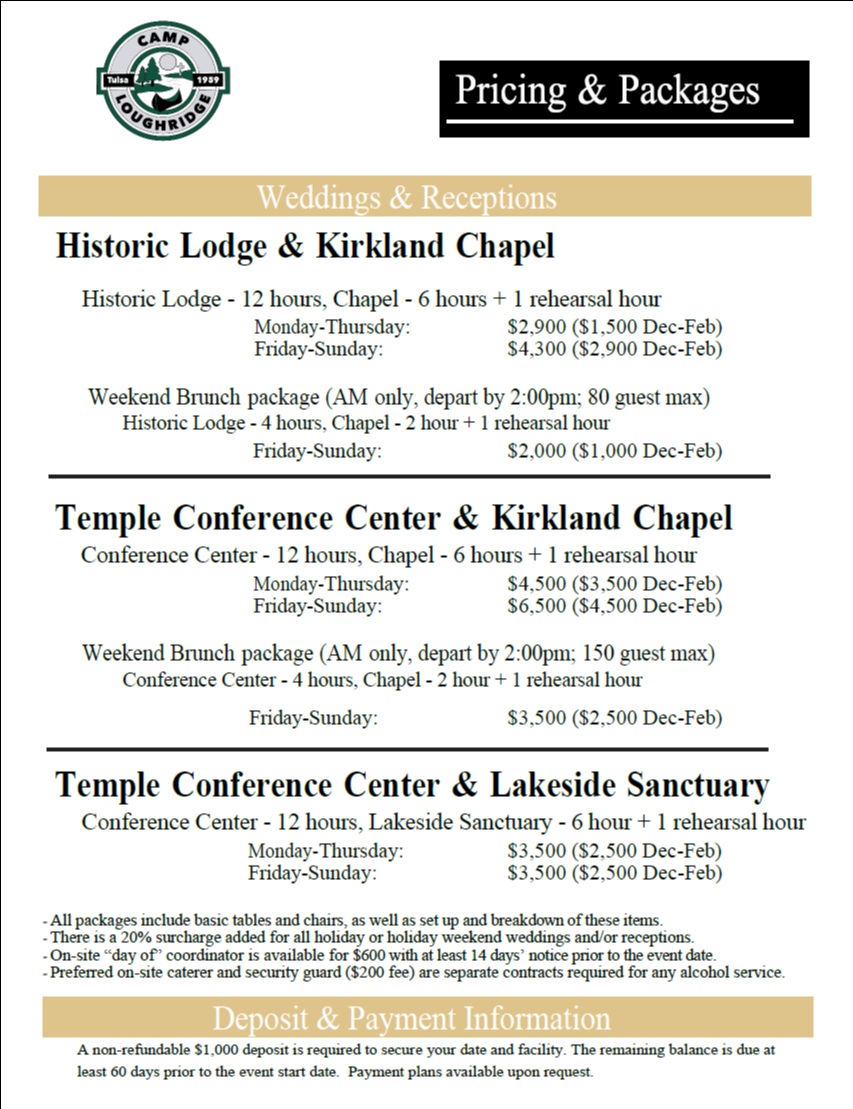 No matter what type of celebration you're envisioning, Camp Loughridge is here to make your special day unforgettable. With beautiful views, versatile spaces, and all the amenities you need, our venue is the perfect place to say "I do" in Tulsa, Oklahoma.